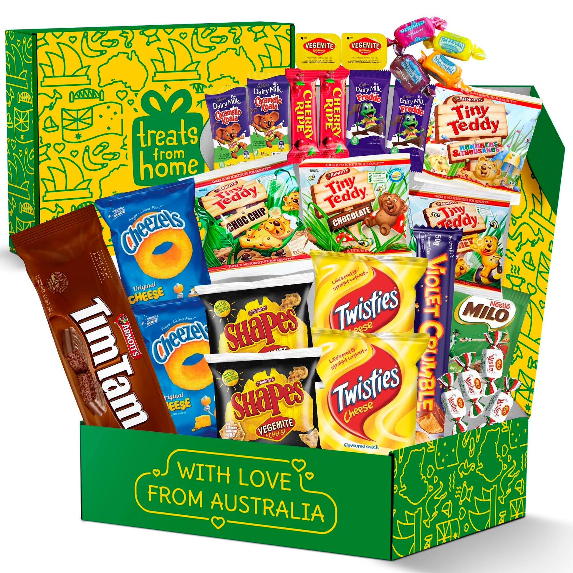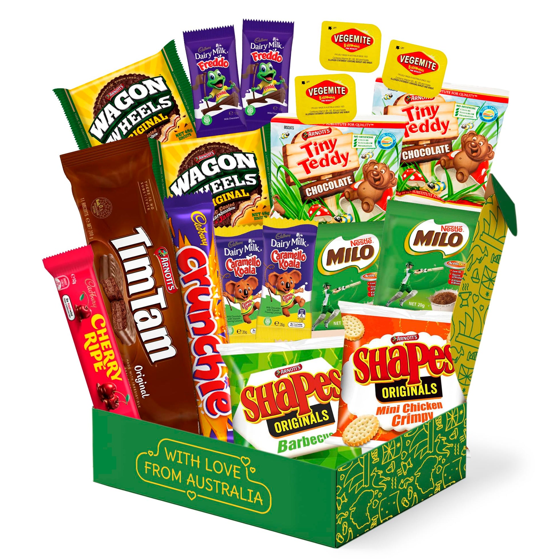 - 18 Authentic Australian Snacks- Includes Tim Tams, Cadbury, Cherry Ripe, Twisties, and Shapes—no mini samples or filler items.
